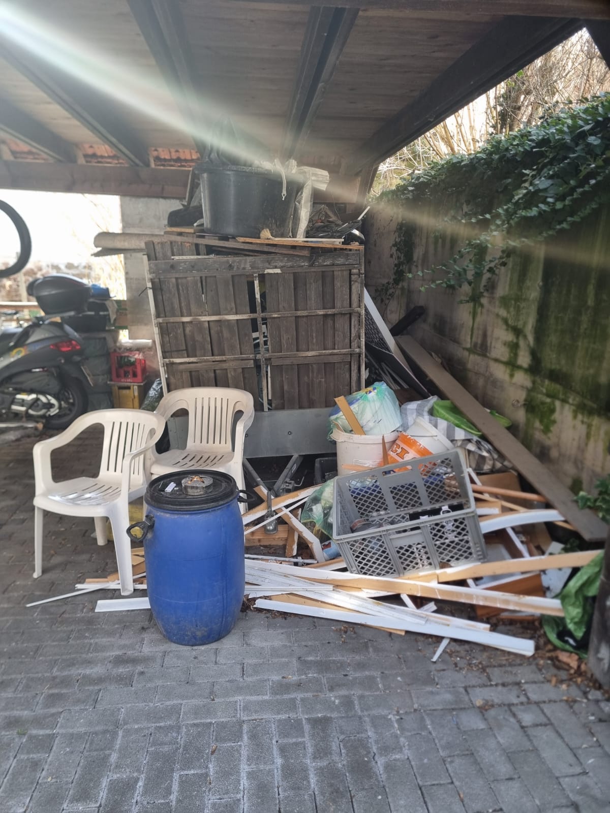 Entrümpelung eines Carports in Stuttgart mit vollständiger Beseitigung von Sperrmüll, Abfällen und gelagerten Gegenständen. Der Außenbereich wurde komplett freigeräumt und sauber aufbereitet.