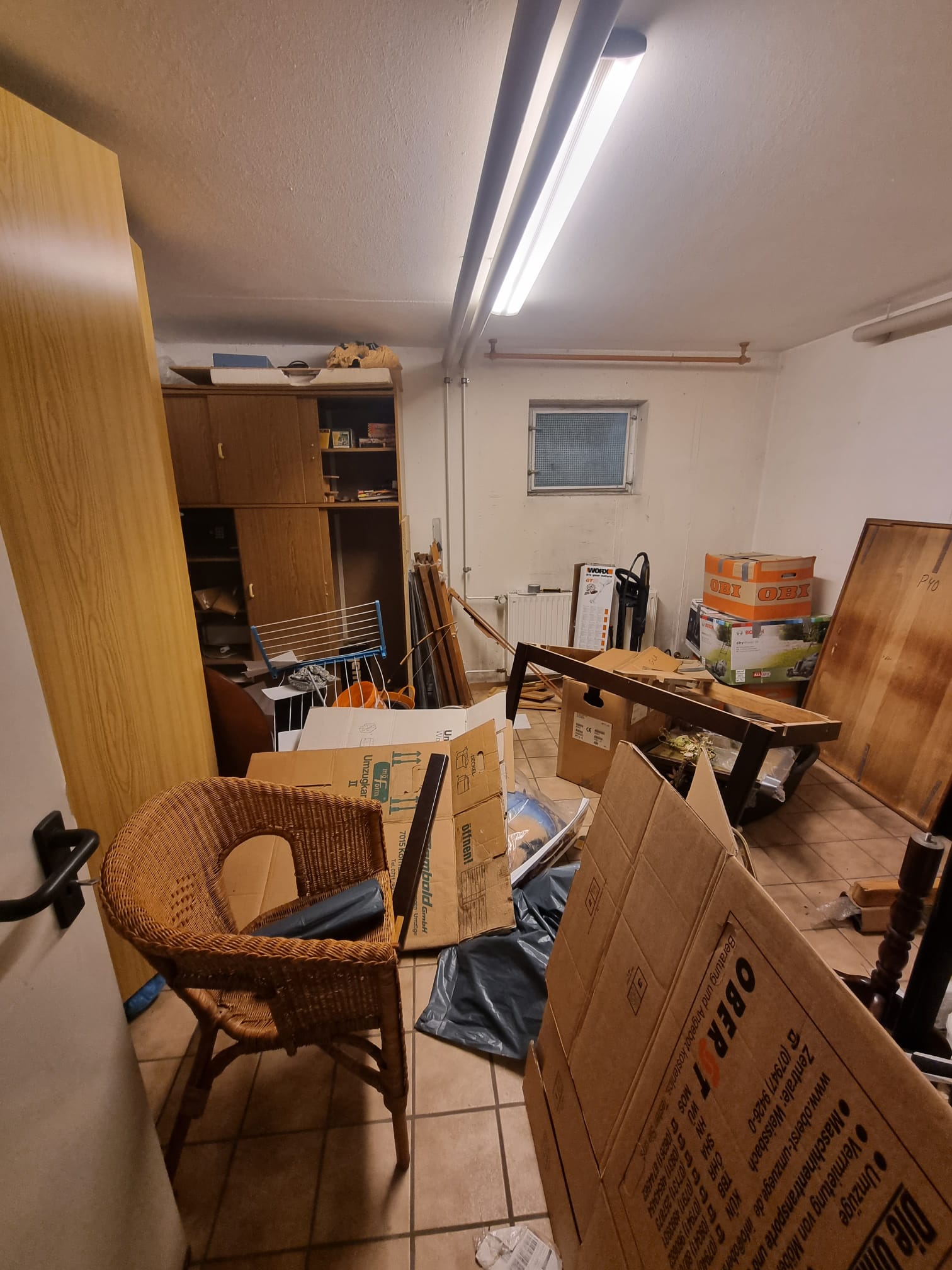 Komplette Räumung eines Kellerraums in Ludwigsburg mit Entfernung von alten Möbeln, Kartons und nicht mehr benötigten Gegenständen. Nach Abschluss wurde der Bereich sauber und leer hinterlassen.